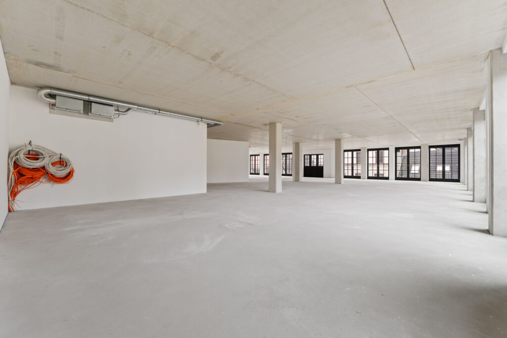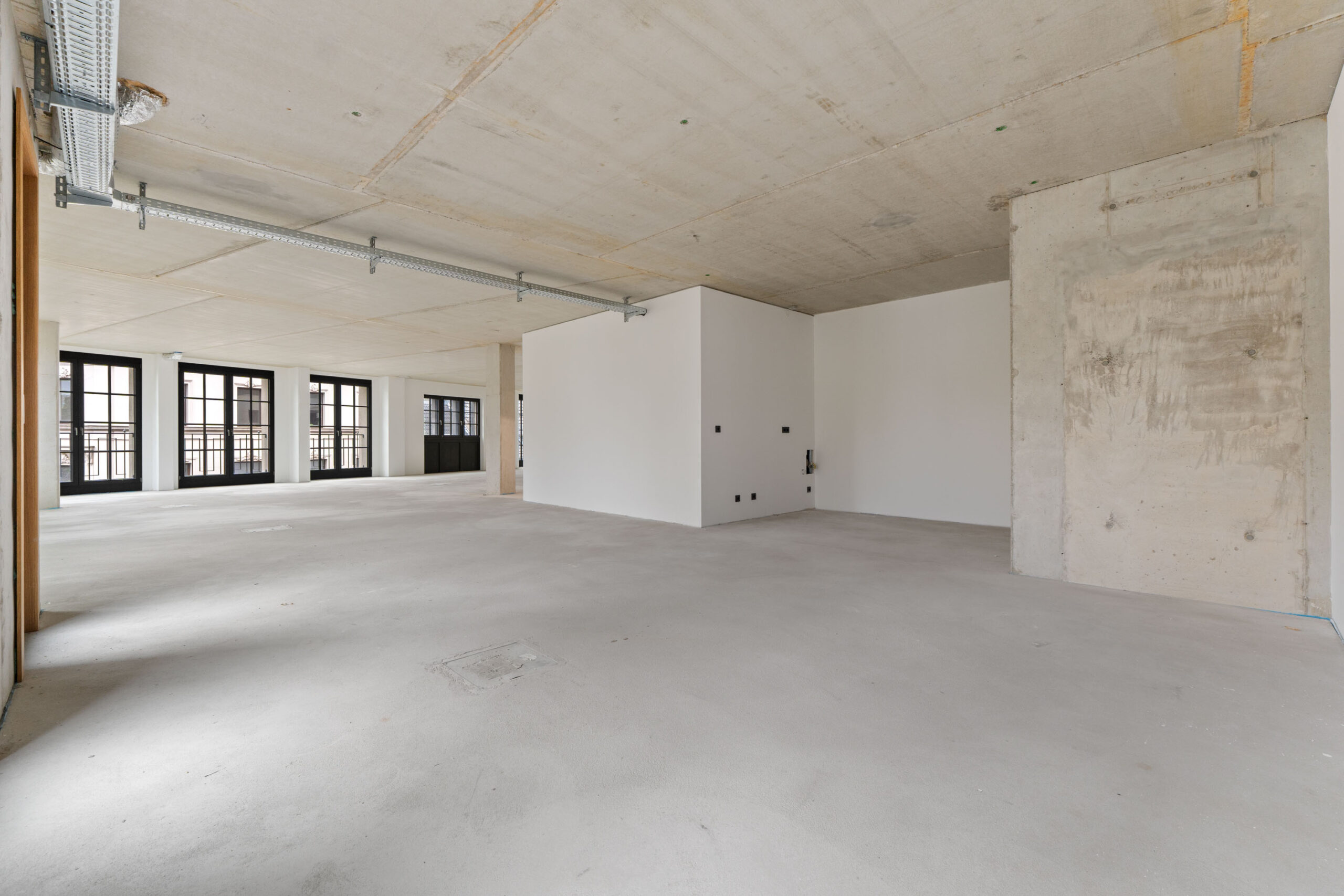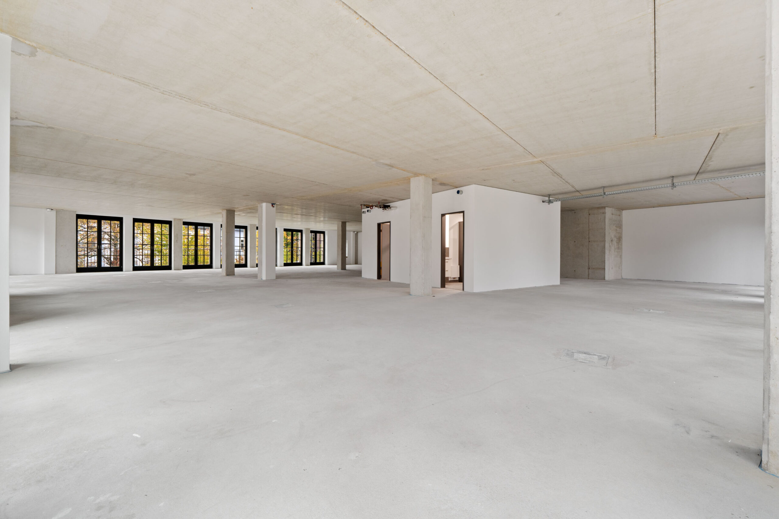 Die Wände werden in einer modernen Optik, ähnlich von Sichtbeton, übergeben, was den Räumlichkeiten einen zeitgemäßen und industriellen Charme verleiht.