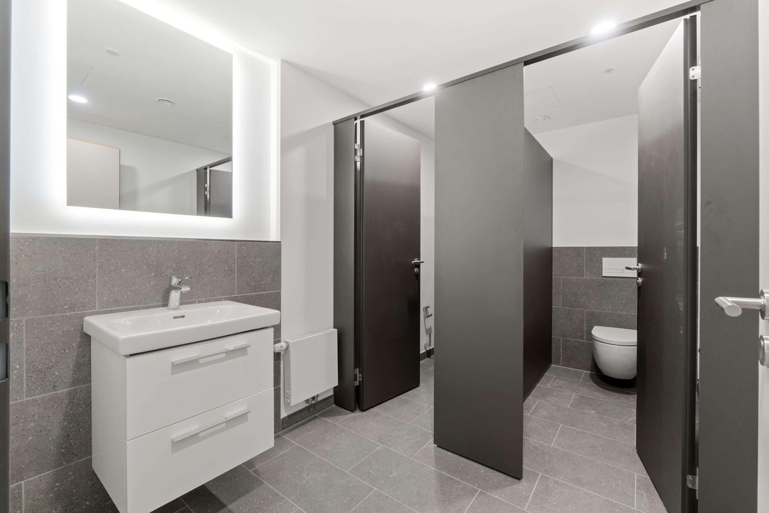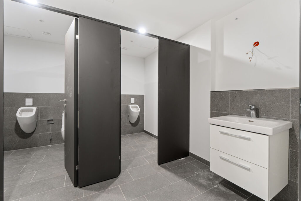 Moderne sanitäre Anlagen sind getrennt für Herren und Damen vorhanden, und barrierefreie WCs befinden sich auf jeder Etage, was den Komfort und die Zugänglichkeit für alle Mieter und Besucher gewährleistet. Diese umfassende Barrierefreiheit betont die moderne und inklusive Ausrichtung des gesamten Gebäudes.