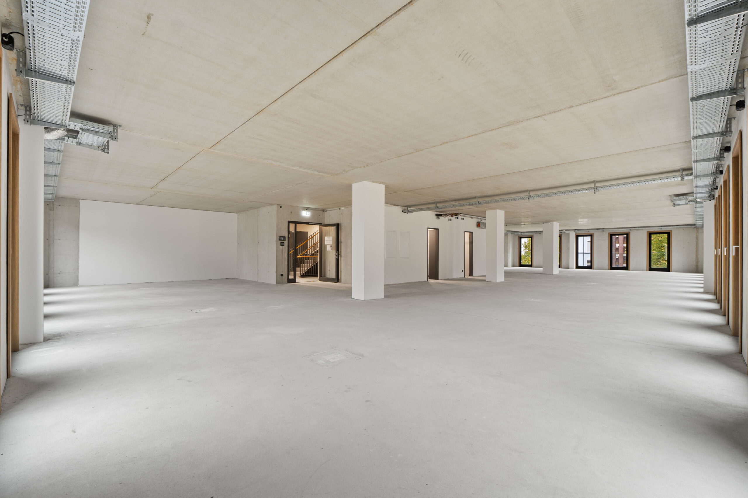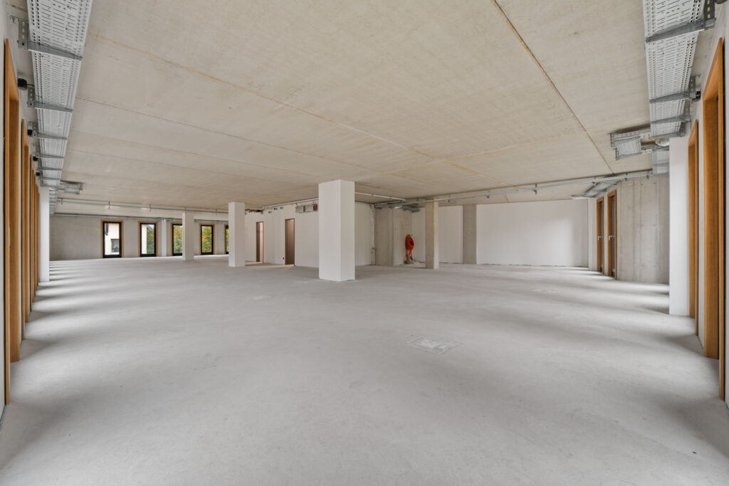 Die Mietfläche 4 zeichnet sich durch ihre flexible Raumaufteilung aus, die dank der Säulenkonstruktion individuell gestaltet werden kann. Diese Flexibilität ermöglicht es, die Fläche genau auf die Bedürfnisse Ihres Unternehmens zuzuschneiden und eine optimale Arbeitsumgebung zu schaffen. Die hochwertige Grundausstattung und der effiziente Raumschnitt bieten ideale Bedingungen für produktives Arbeiten. Der Mietpreis von 12,50 EUR/m² bezieht sich auf diese Grundausstattung, wobei auf Wunsch individuelle Planungen und spezielle Ausstattungswünsche berücksichtigt werden können.